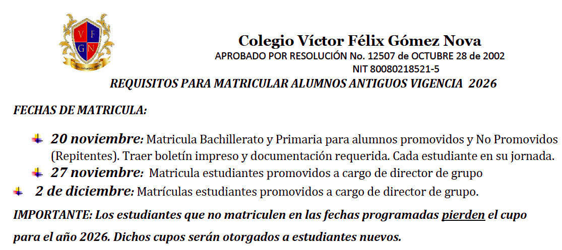REQUISITOS PARA MATRICULAR ALUMNOS ANTIGUOS VIGENCIA 2026 FECHAS DE MATRICULA: 20 noviembre: Matricula Bachillerato y Primaria para alumnos promovidos y No Promovidos (Repitentes). Traer boletín impreso y documentación requerida. Cada estudiante en su jornada. 27 noviembre: Matricula estudiantes promovidos a cargo de director de grupo 2 de diciembre: Matrículas estudiantes promovidos a cargo de director […]